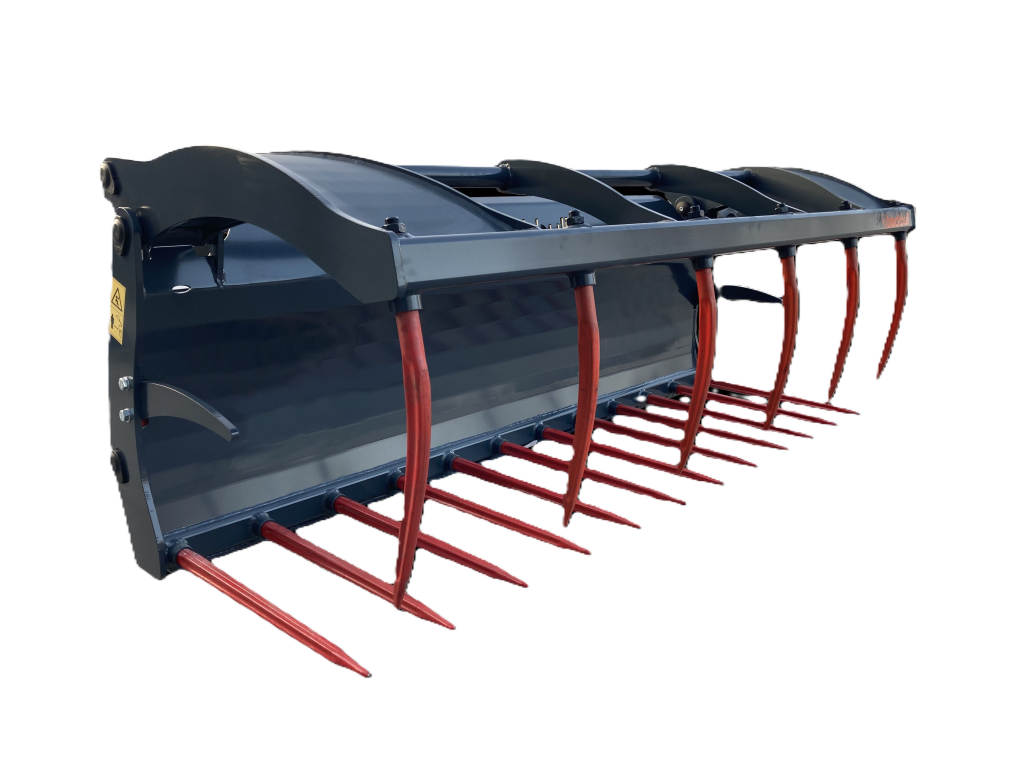 Trágyavilla: 150-200 cm szélességben. Kramer, Q-fit, Manitoués Merlo csatlakozással. Kovácsolt, dupla kúprendszerrel ellátott cserélhető tüskékkel és cserélhető felső fogakkal. Zárás 2 db kettős működtetésű hidraulikus munkahengerrel.