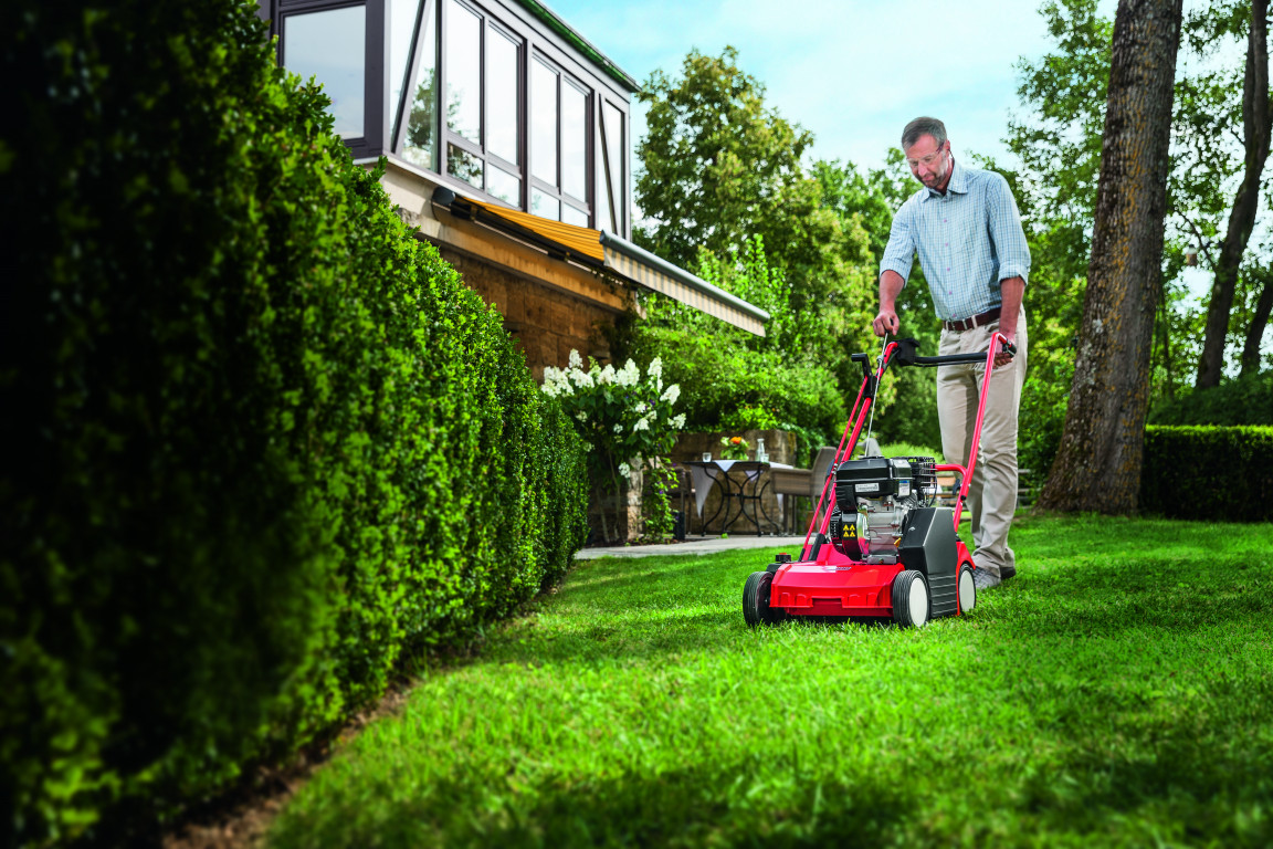 Prémium minőségű, 38 cm munkaszélességű benzinmotoros gyepszellőztető, robusztus alumínium házzal és 15 db szellőztető csillagkéssel. Ideális akár 1500 m² nagyságú területek rendszeres karbantartására.