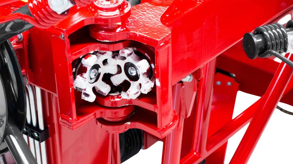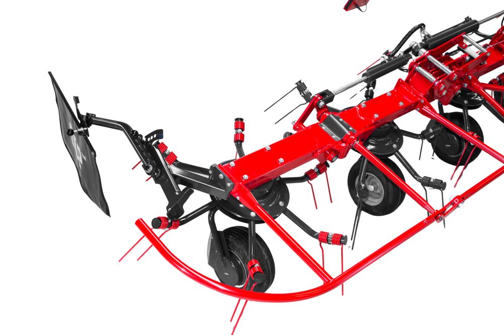 A szabadalmaztatott hidraulikus beállítási lehetőséggel szabályozható a rugós fogak talajtól való távolsága. Csakúgy, mint a szórás szöge 13°-tól 19°-ig és 15°-tól 21°-ig. Így a szóráskép a vágási magassághoz, valamint a takarmány mennyiségéhez és nedvességtartalmához igazítható. A gép meghajtása egy központi biztonsági tengelykapcsolóval ellátott osztóművön keresztül oldallehajtások segítségével történik. A tagok közti meghajtást speciális ujjas tengelykapcsolók végzik, amelyek a gép minden pozíciójában képesek a hajtásátvitelre, méghozzá rendkívül sima és csendes futással, mindezt karbantartásmentesen.